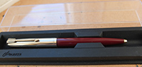 par1253: A mint uninked 180 in 'Red Quartz' finish with gold-filled trim and a extra-fine/medium grade nib; the pen dates from 1983 or thereabouts; the feed has X/M on it which means that when writing on one side of the nib it is extra-fine and when writing on the other side it is medium. £125.00 SOLD |