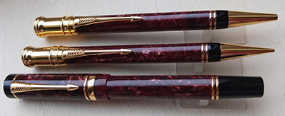 par1104: A Parker International fountain pen, ballpen, and pencil set in red marbled finish with gold-filled trim; it has not been used much so is in lovely condition; the pen has a fine grade 18ct gold nib and writes nicely £365.00 SOLD |