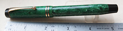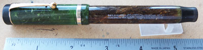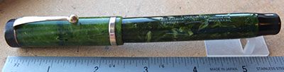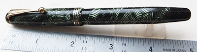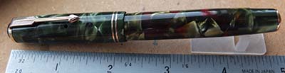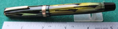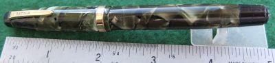 par844: A very nice condition Canadian Junior vacumatic fountain pen in green, black and red marbled finish from 1934 or thereabouts; the pen has a nice single-colour broad oblique grade 14ct gold Vacumatic nib; it writes delightfully. £95.00 SOLD |