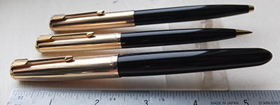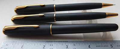 par1121: A very nice 51 aerometric fountain pen, ballpen, and pencil set in black with gold-filled caps; the fountain pen has a medium grade 14ct gold nib; this is a lovely example of a desireable pen set. £195.00 |