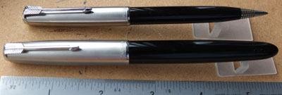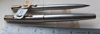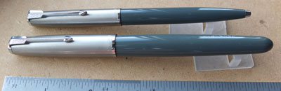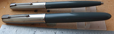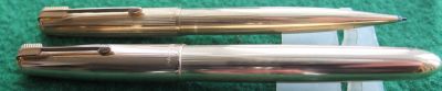 par349: A lightly-used 51 fountain pen and ballpen set in grey with lustaloy caps and in their original box; the pen is an aerometric(squeezy)-filler and has not had a lot of use looking at the condition of it as the sac is see-through and there are still chalk marks on the pen barrel; the ballpen is equally good but no chalk marks; the pen has a medium grade 14ct gold nib and writes nicely £175.00 SOLD |