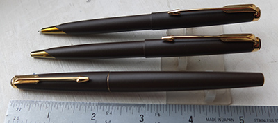 par1268: A mint but inked Parker 61 Custom fountain pen, pencil and ballpen set; the pen is a cartridge or converter-fill and has a converter fitted; the pen has a medium grade 14ct gold nib; this is a lovely desireable pen set and boxed too; please note the ballpen has been used a little. £255.00 SOLD |