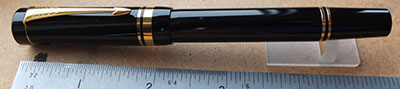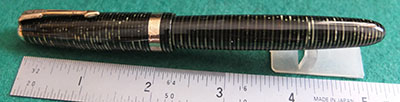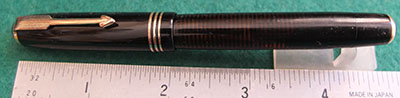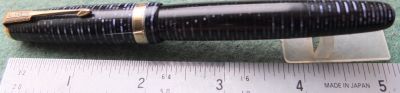 par847: A Canadian Parker Junior Lucky Curve Duofold in black from 1926 or thereabouts in good mechanical condition with a nice broad grade 14ct gold nib and two cap bands £115.00 |