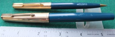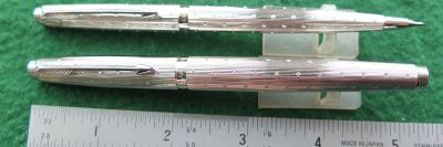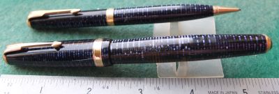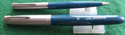 par1207: A mint Mk. II 51 aerometric fountain pen and pencil set in blue with gold-filled caps; the fountain pen has a medium grade 14ct gold nib; this is a lovely desireable set that still has the original factory chalk marks and boxed too. £165.00 |
