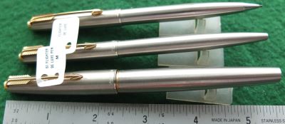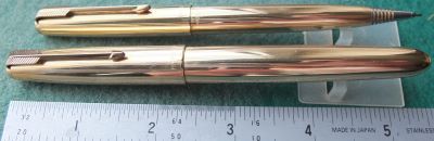 par984: A 51 fountain pen and ballpen set in grey with lustaloy caps; the fountain pen and ballpen have been used but not a lot; they are in lovely condition and will last for years; the fountain pen is a squeezy-fill and has a medium grade 14ct gold nib and writes nicely. The ballpen is good too. £125.00 |