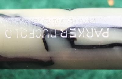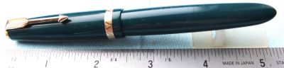 par870: Here we have a Parker Senior Duofold Lucky Curve fountain pen in jade green permanite with gold-filled trim and a 14ct gold broadish medium oblique grade nib; this is a very nice one and writes nicely too. £225.00 SOLD |