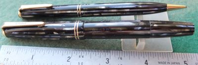 par1249: A very nice condition 'Duovac' (duofold vacumatic) fountain pen and pencil set in blue, silver and black from 1939 with a fine grade 14ct gold nib. Canada made and has a Canadian nib. £135.00 SOLD |