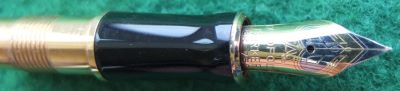 par1305: A very nice condition Over-size vacumatic fountain pen in black from 1934 with a very nice 'rubbed' two-colour medium grade 14ct gold nib; this is a very desireable pen and hard to find especially in this condition. £325.00 |