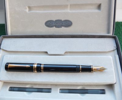 par881: A Parker International fountain pen in black with gold-filled trim; it has not been used much so is in lovely condition; the pen has a medium grade 18ct gold nib and writes nicely £185.00 |