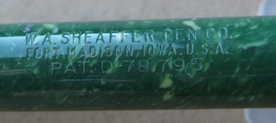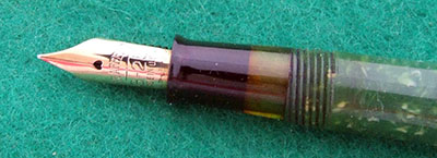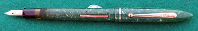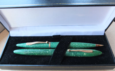 This is a very nice 3-25 pen and pencil set in the lovely green jade colour, made in the 1930s, and nice to hold and write with; the nib is single colour 3-25 fine grade and writes nicely; the trim is gold plated and there is hardly any signs of plating wear on the bands or the clips. There is slight darkening of the pen but the pencil is as near to the original colour as one can get.