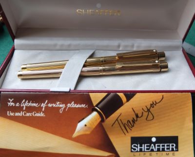 This pen set is in quite beautiful condition and I think it has not been used very much; it dates from around 1985; it has no cracks or splits and no dings either; the clips are secure. The nib of the fountain pen is a steel fine grade and the pen is a cartridge or converter-filler and has a converter fitted; the set is supplied with a new set of slim cartridges; a delightful pen set for everyday use, and will last for years to come too.