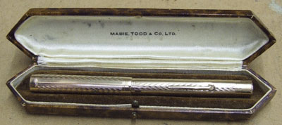 swan049: A Swan lever-filler fountain pen in 9kt gold, made by Mabie Todd & Co. in New York, and in its original box which is a bit tatty. £325.00 |