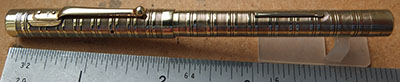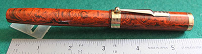 swan172: A mechanically sound and perfectly functional Swan (L245/62 I think) leverless fountain pen in wine and silver marble with gold-plated band and a No.2 broad grade 14ct gold nib; it writes nicely and is fairly flexible; this pen is shorter, both the cap and the barrel, than others I have seen and is the clipless version. £95.00 SOLD |