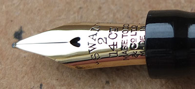 Here is a classy-looking Swan L205/52 leverless in very nice condition, albeit a little worn through use, with a 14ct gold medium grade No.2 nib; the pen is in very good condition but there are signs of use in the form of a little wear where the cap fits and where it has been posted; there are no cracks, splits or serious scratches and no signs of plating wear on the clip or the band; the nib, by my classification, is a nice writer but not very flexible; this pen would make a good daily-use pen or could be added to a collection and not look out of place.