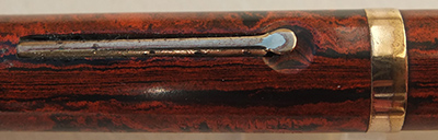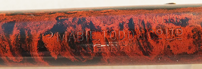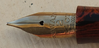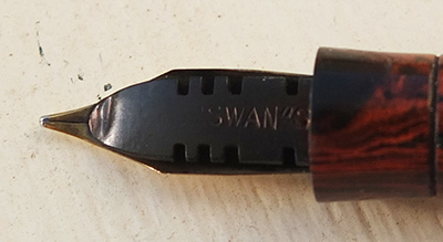 Here is a mechanically-sound Swan SF230C lever-fill in very nice condition, albeit a little worn through use, with a 14ct gold fine grade No.2 nib; the pen is in very good condition but there are signs of use in the form of a little wear where the cap fits and where it has been posted; there are no cracks, splits or serious scratches but slight signs of plating wear on the clip and the bands; there is a little pitting on the lever; the nib, by my classification, is a nice writer and quite flexible; this pen would make a good daily-use pen or could be added to a collection and not look out of place. Please note this pen has EF Marston engraved on the barrel and the pattering on the cap looks a little different to that on the barrel; Mrs. Marston has assured me the cap and barrel are original and she has had it from new.