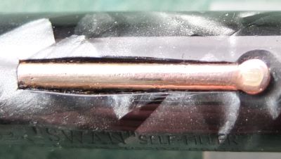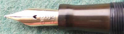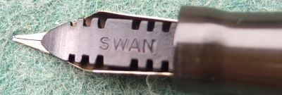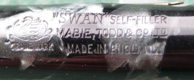 Here is a classy-looking Swan self-filler in very nice condition, albeit a little worn through use, and with a slightly bulging lever slot; the pen has a 14ct gold fine grade No.3 nib; the pen is in very good condition but there are signs of use in the form of a little wear where the cap fits but not where it has been posted; there are no cracks, splits or serious scratches and only slight signs of plating wear on the clip and the bands; the nib, by my classification, is a nice writer and is a little flexible; this pen would make a good daily-use pen or could be added to a collection and not look out of place.