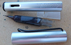 bel263: A used Lamy fountain pen in brushed plastic with a medium grade nib; it uses cartridges or a converter and both are readily available on the High Street. £15.00 |