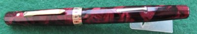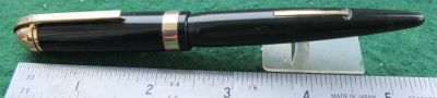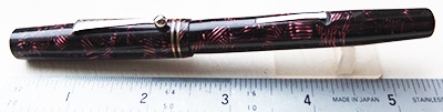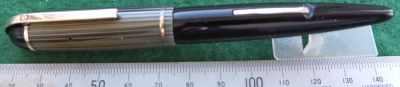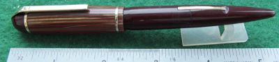 wahl033: A very nice Wahl Oxford fountain pen in burgundy and black lined finish from 1936 or thereabouts; this pen is a lever-filler; the pen has an Eversharp fine grade 14ct gold nib; it writes nicely £155.00 |