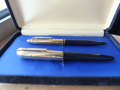 A very nice Wahl Eversharp Skyline fountain pen and pencil set in blue with 14ct gold caps; this pen is a lever-filler and has a nice fine grade 14ct gold nib; there is no wear apparent on the barrel where the cap fits and where it is posted; generally the pen is very good with an undamaged, secure and springy clip.