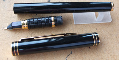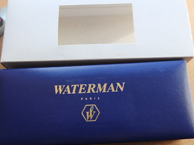 Here is a lightly used Waterman Exclusive fountain pen and ballpen set in black with gold-plated trim and in its original box; it was made around 1989 and has been used but not a lot; it looks lovely and will perform really well; the pen has a fine grade 18ct gold nib and is a cartridge or converter-filler and has a converter fitted; the ballpen has a new refill fitted; the set comes with its leaflet; cartridges are readily available from any stationery shop. Please be aware that the cap tops have PB engraved on them but in normal use would not be seen.