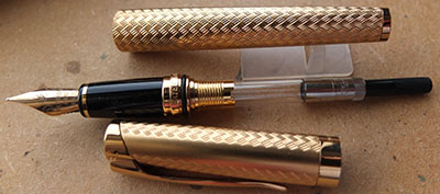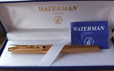 Here is a new-old-stock Waterman L'Etalon fountain pen in the gold-plated finish with gold-plated trim and in its original box; it was made around 1989 and has never been used; I have dipped it to ensure it writes nicely; it looks lovely and will perform really well; the pen has an 18ct gold medium nib and is a cartridge or converter-filler and has a converter fitted; the pen comes with its leaflet but no cartridges; cartridges are readily available from any stationery shop.