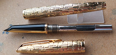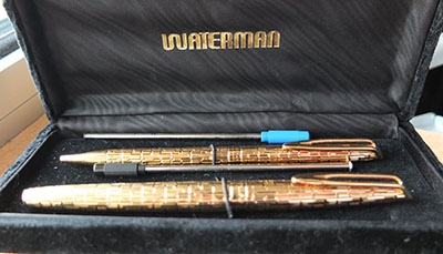 Here is an inked but immaculate-condition Waterman CF (cartridge-fill) fountain pen and ballpen set in Plaque Org gold-plated finish; the set is in its original box with 2 unused ballpen refills and a new-old-stock original converter; the box is good; the pen has been inked but there are no marks on either pen or ballpen; the nib is a medium grade 18ct gold and it writes very nicely and would make a lovely everyday pen set.