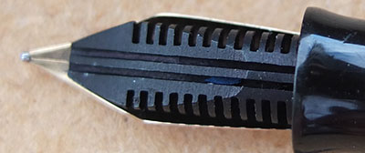Here we have a very nice desk pen with a fine grade 14ct gold No.5 nib; the imprint on the barrel is hardly readable; the plating on the lever and the bands is good; there are no cracks, splits or noticeable scratches; this is a big pen.