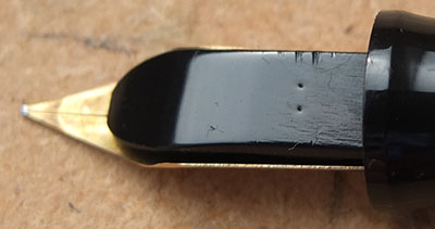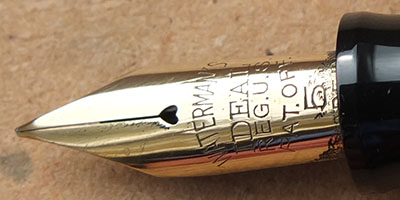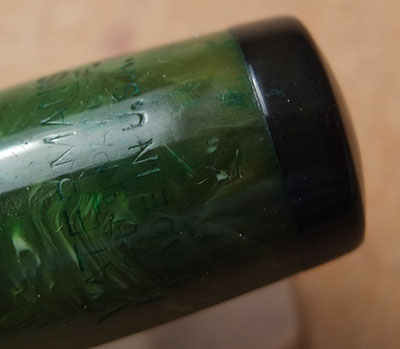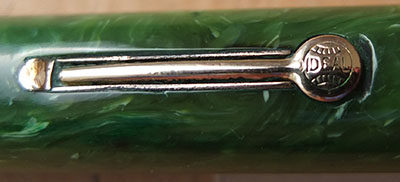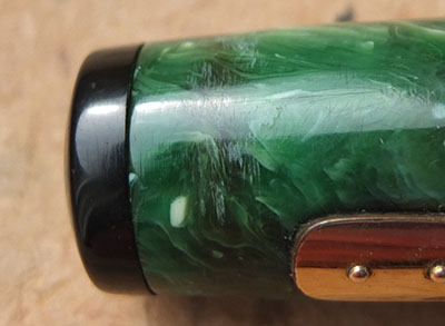 Here is a very-nice very-rare Waterman's Transitional Patrician in jade that is a Waterman-collectors 'must have'; it was made around 1928 and has had little use however, the top of the cap has darkened a little; this is a pretty pen with gold-plated trim and an enormous 14ct gold No.5 fine grade 14ct gold slightly-flexible nib; it looks pretty good and will perform really well but should really be added to a collection; the imprint is readable but worn; the plating is good. You will be thrilled with this one despite the price. This pen is not to be confused with the late-30s pens put together with left-over Patrician parts.