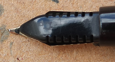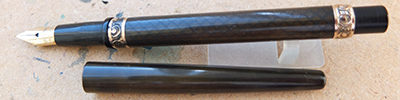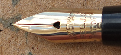 Here is a very nice 22 (I think) in black hard rubber; it was made in the late 1910s or early 1920s and has been used; the pen has a No.2 medium grade 14ct gold nib which is a little flexible; the pen is an eye-dropper-filler which needs to be filled from a bottle. There is no imprint visible on the barrel side and there is no number on the barrel end either.