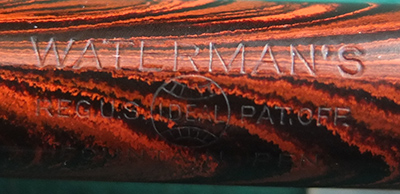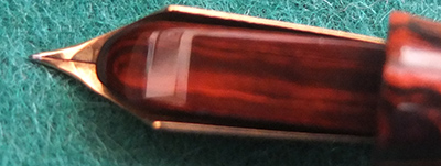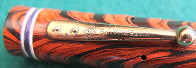 Here we have a very nice No.5 fountain pen in red ripple with gold plated trim; the pen has a purple coloured nib and cap band; the imprint on the barrel is very readable and there is just a little sign of marking where the cap fits and where it is posted; the plating on the lever is good as it is on the clip and the cap band; there are no cracks, splits or noticeable scratches; the clip is secure and the number 5 on the end of the barrel is clearly readable.