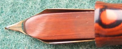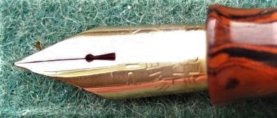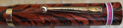 Here we have a very nice No.5 fountain pen in red ripple with gold plated trim; the pen has a pink coloured nib and cap band; the imprint on the barrel is very readable and there is just a little sign of marking where the cap fits but not where it is posted; the plating on the lever is good as it is on the clip and the cap band; there are no cracks, splits or noticeable scratches; the clip is secure and the number 5 on the end of the barrel is clearly readable.