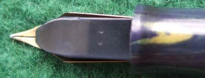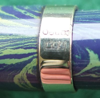 Here we have a very nice No.52V fountain pen in blue and yellow ripple with gold plated trim; the pen has a 14ct gold fine grade nib and writes nicely; the imprint on the barrel is readable and there is just a little sign of marking where the cap fits but not where it is posted; the plating on the clip and the lever is good; there are no cracks, splits or noticeable scratches; the clip is secure and the number 52V on the end of the barrel is clearly readable; the cap band is 9ct gold.
