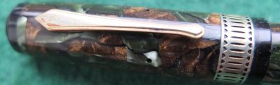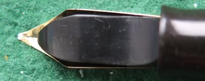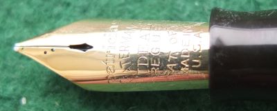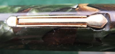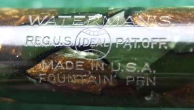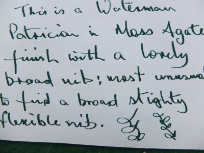 Here is a very nice and quite rare Waterman's Patrician in moss agate finish with a rare broad nib; the lever and leverbox are both good as is the globe on the end of the barrel; it was made around 1930 and has had little use; this is a pretty pen with gold-plated trim and an enormous 14ct gold USA Patrician broad grade nib; it looks lovely and will perform really well; the imprint is very readable and the plating is good. You will be thrilled with this one as the price is so reasonable for such a rare pen.