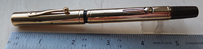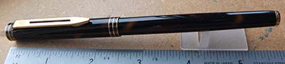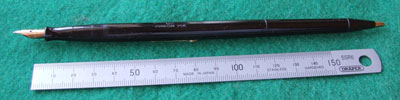 wart253: A very nice 9ct-gold plane finish over black hard rubber lever-filler in nice condition albeit with a few small marks; this pen has a 9ct gold clip and a broad oblique grade softish No.2 nib; writes beautifully too. £325.00 SOLD |