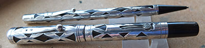 wart282: A very nice Sterling Silver over black hard rubber lever-filler in lovely condition and in the Gothic finish; this pen is the clipless version and has an engraving on the cartouche; it has a medium grade 14ct gold No.2 nib; writes beautifully too and with a little flexibility. £375.00 |