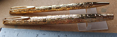 wart208: An immaculate CF Bijouterie fountain pen and ballpen set in gold-plated crocodile pattern caps and barrels with a new-old-stock original converter fitted in the pen; there are two new unused working ballpen refills and replacements are available from Custom Pen Parts £325.00 |