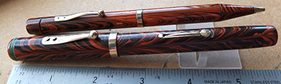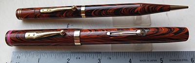 wart255: A very nice No.7 red ripple fountain pen and pencil set with gold plated trim; the pen has a purple nib and a pinkish purple cap band; the nib is a fine grade 'stiff' point 14ct gold and 'writes without pressure' suiting 'the accountant' to quote Waterman; it does write nicely but with no flexibility. The pencil is good with spare leads. £525.00 SOLD |