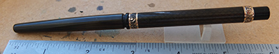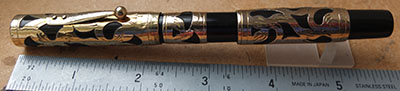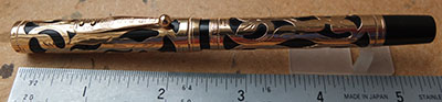 wart267: A nice-condition 54 in black chased finish with gold plated lever and two 9ct gold barrel bands; this pen has a medium grade 14ct gold No.2 nib which writes nicely with quite some flex. £115.00 SOLD |