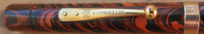 wart276: A very nice No.7 red ripple fountain pen with gold plated trim; the pen has a purple nib and a sightly faded purple cap band; the nib is a fine grade 'stiff' point 14ct gold and 'writes without pressure' suiting 'the accountant' to quote Waterman; it does write nicely but with no flexibility. £425.00 SOLD |