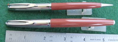 wart209: A very nice No.7 red ripple fountain pen and pencil set with gold plated trim; the pen has a green nib and a green cap band; the nib is a 'rigid' point 14ct gold and is 'tempered-to-armour-plated-hardness' suiting 'the salesman' to quote Waterman; it does write nicely but with no flexibility. The pencil is good with spare leads. £525.00 |