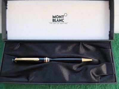 oeu297: A used Mont Blanc ballpoint pen in black with gold-plated trim; this pen is in lovely condition, albeit it has a few scratches, and boxed too. It is genuine as are all the other MB pens on my site but it doesn't have a serial number. £120.00 |