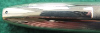 This is another green PFM V pen in perfect mechanical condition but has been used so there are fine surface scratches visible under a glass however, it is in beautiful condition; this cap and barrel are both good with no plating wear to the cap and trim, one small mark on the cap as shown in the last picture, and only small dents to the cap top; the clip is secure but the head of the white button is missing. The nib is a lovely broad grade 14k gold and writes nicely.