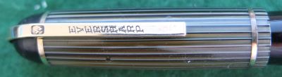 A very nice Wahl Eversharp Skyline in black with a green and black striped cap; the pen is a lever-filler and has a fine grade 14ct gold nib.