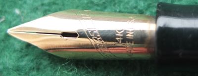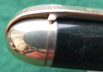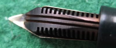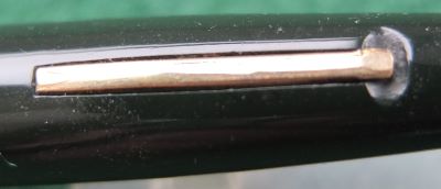 A very nice Wahl Eversharp Skyline in dark green and has a gold-plated crown at the top of the cap; the pen is a lever-filler and has a fine grade 14ct gold nib. The crown, clip and band are all good but the lever has some plating wear.