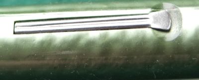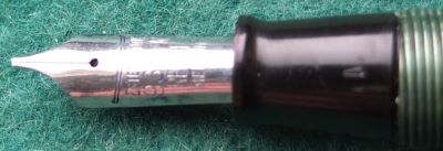 Here is a very nice lever-fill Esterbrook Relief fountain pen in green striated finish with nickel-plated trim. The pen has a medium oblique grade steel nib; its beautiful to write with and there are no signs of wear on the barrel where the cap posts or where the cap fits and there is no other damage. The plating on the lever, the band, and the clip is good; the imprint is readable. Its in lovely condition