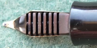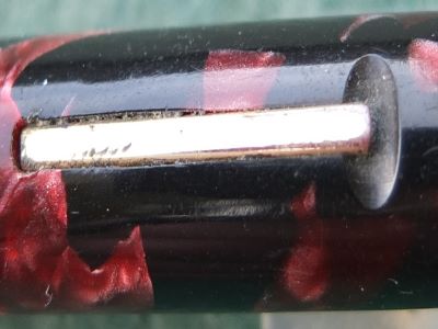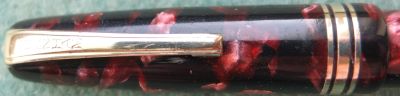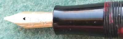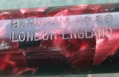 Here is a very nice lever-fill Burnham 60 fountain pen in red and black with gold-plated trim. The pen has a medium grade 14ct gold nib; its beautiful to write with and there are no signs of wear on the barrel where the cap posts or where the cap fits and there is no other damage. The plating on the lever, the band, and the clip is good; the imprint is crisp. Its in lovely condition