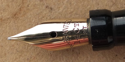 Here is a very nice, almost mint, Morrison's lever-fill fountain pen in black with a 1/40th 14kt gold filigree overlay; the pen has not had a lot of use from looking at its condition and the gold plating is very good; the pen has a 14ct gold fine grade nib. The cartouche is blank.