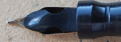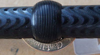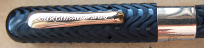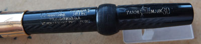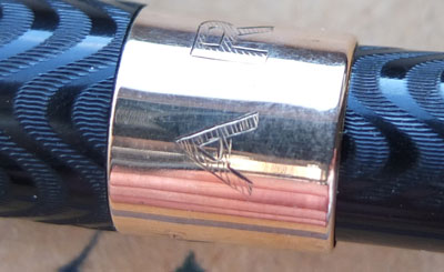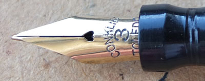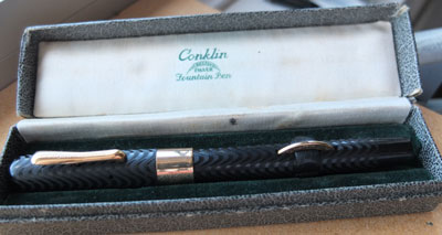 Here is a very nice, nay beautiful, Conklin crescent-fill fountain pen in black with gold plated trim; the pen has not had a lot of use from looking at its condition and the gold plating is good; the cap has a 1/5th 14ct gold band which has 'AR' lightly engraved on it;; the imprint is filled with a gold-coloured material which I think is original from the factory; the pen has a 14ct gold fine grade Conklin No.3 Toledo nib. The pen is boxed and I think that is original too; please note the section has a mark round it which may have been caused by a pair of pliers.
