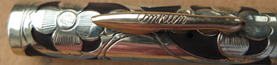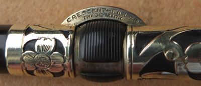 Here is a very nice, nay beautiful, Conklin crescent-fill fountain pen in black with gold plated filigree overlay and trim; the pen has not had a lot of use from looking at its condition and the gold plating is good apart from a few spots of plating wear; the pen has a 14ct gold fine grade Conklin Toledo nib.