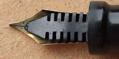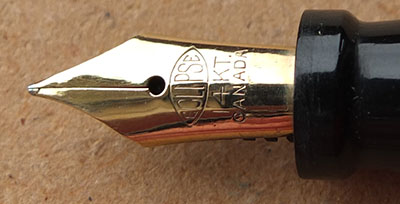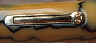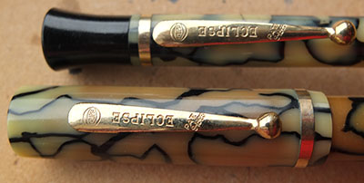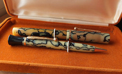 Here is a very nice Eclipse lever-fill fountain pen and pencil set in black and pearl marble with gold plated trim; the pen has not had a lot of use from looking at its condition however, it is darkened a little; the gold plating is good apart from on the balls of the clips where there is a little wear; there are surface scratches consistent with years of handling but no cracks or splits; the pen has a 14ct gold medium grade Eclipse nib and isa a smooth writer. The set is boxed but its not the correct one.